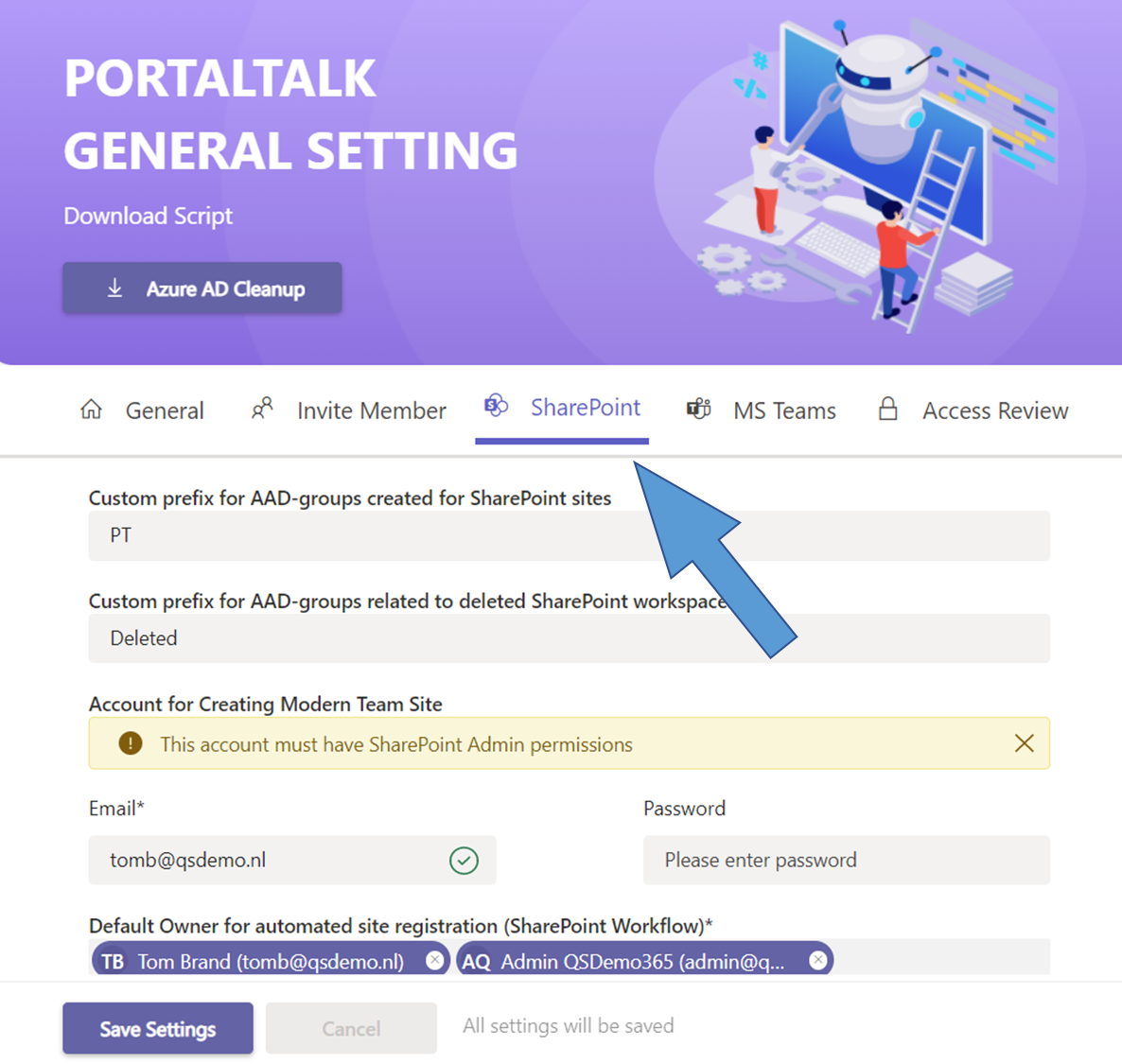 Password - Enter the password for the account email address entered in the previous field.Default Owner for automated site registration (SharePoint workflow) - Select the users to be assigned as team owner to a SharePoint workspace if same is not provided, or with an unrecognizable email address, through the SP workflow or Site Create API.