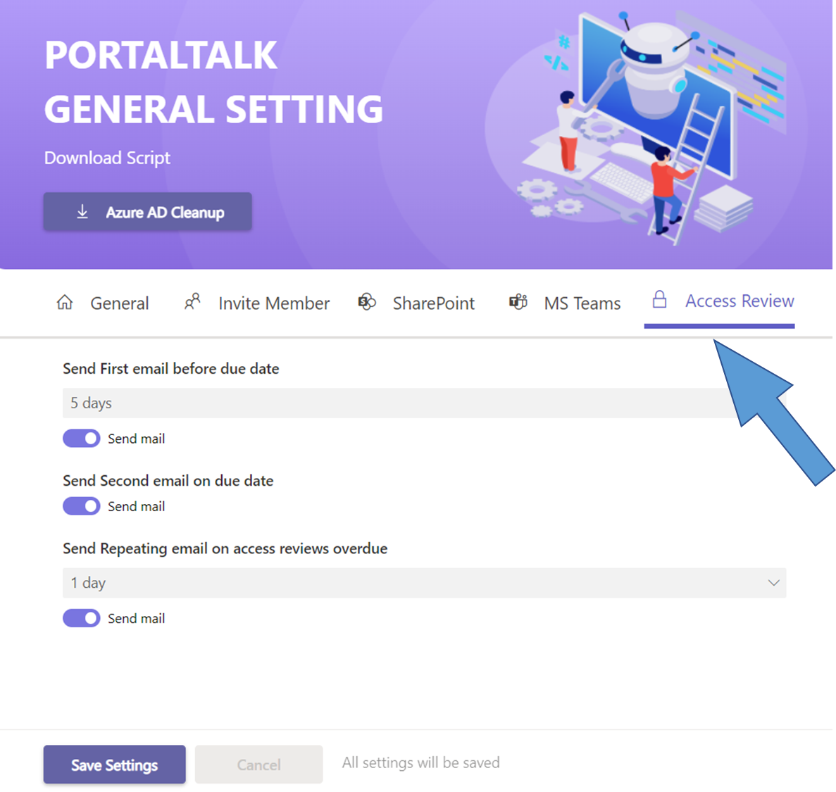 Send Repeating email on access reviews overdue (Send mail/Do not Send mail) - When one or more workspaces becomes overdue to an Owner, a repeating email start to be sent every number of days configured for these settings (between 1 and 10 days). As long as there are still overdue workspaces for this Owner, the mail will be sent. If all access reviews are done for this user, the mail will not be sent anymore.