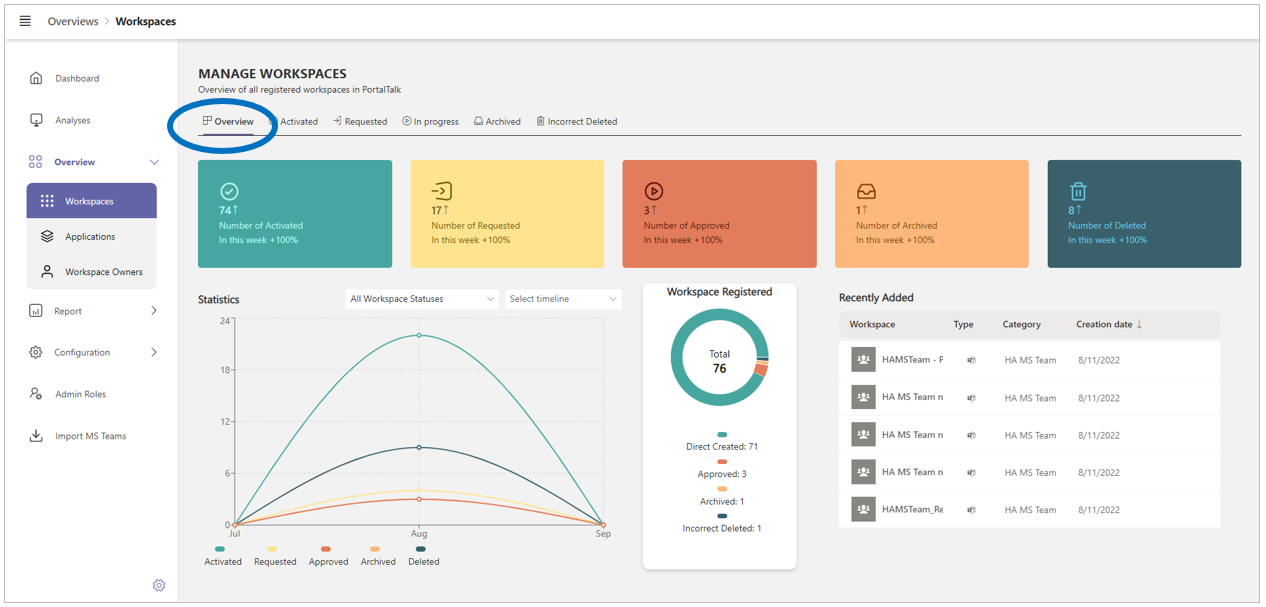 The Overview tab of the Manage Workspaces page contains the dashboard for the PortalTalk admin.