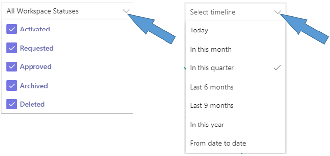 This dashboard is also the start screen of the Admin Center. It provides you with insights on the volume and status of the workspaces both currently and in the past.