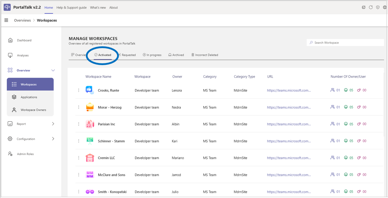 The tab view displays all workspaces within the concerned category with the various workspace settings - below is a screenshot of the Activated workspaces view.